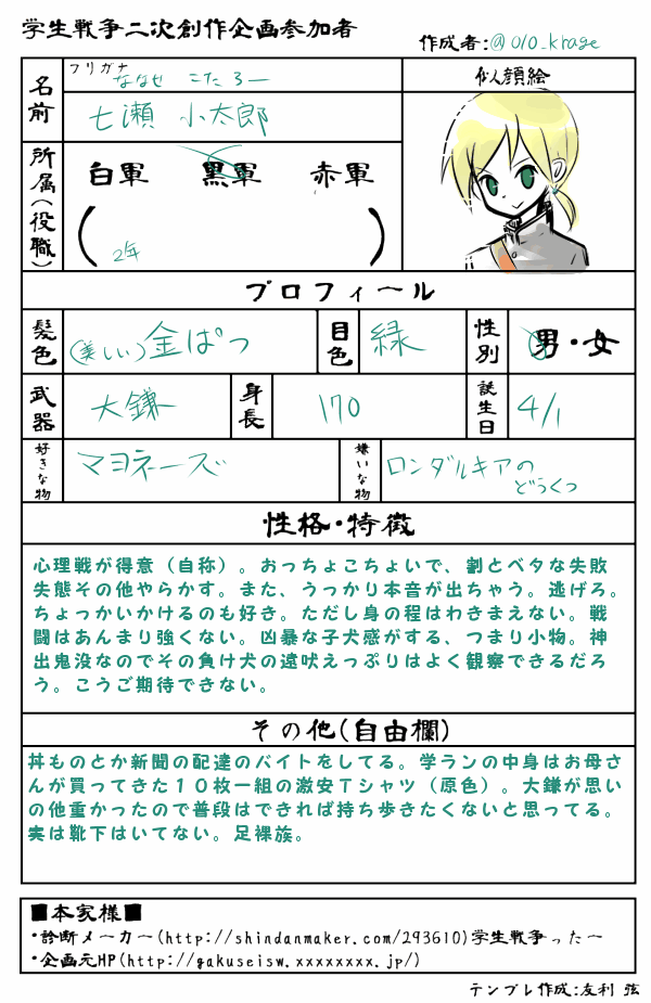 創作なの?って言われるとあれだけど、じゃあ版権なの?って言われるとそんなことはないな、ってことでとりあえずこっちに分類。春先頃に身内で一瞬だけ流行ってました学生戦争。まとめです。うちの子とご友人たちの子もちょろっとでてきます。
